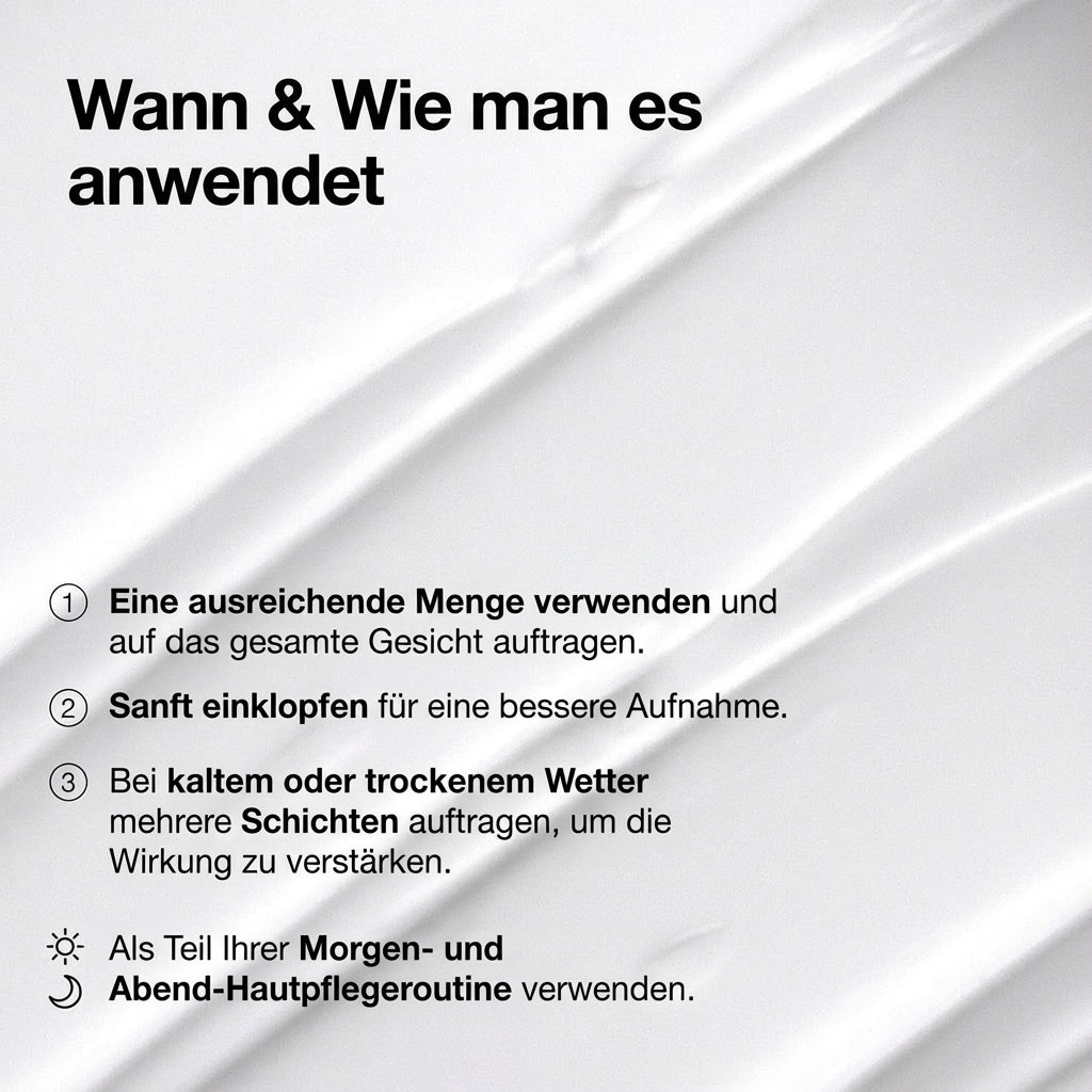 Morgens und/oder abends nach Toner/Serum auftragen. Eine erbsengroße Menge reicht meist für Gesicht und Hals. Sanft verteilen, auch über gereizte Bereiche.