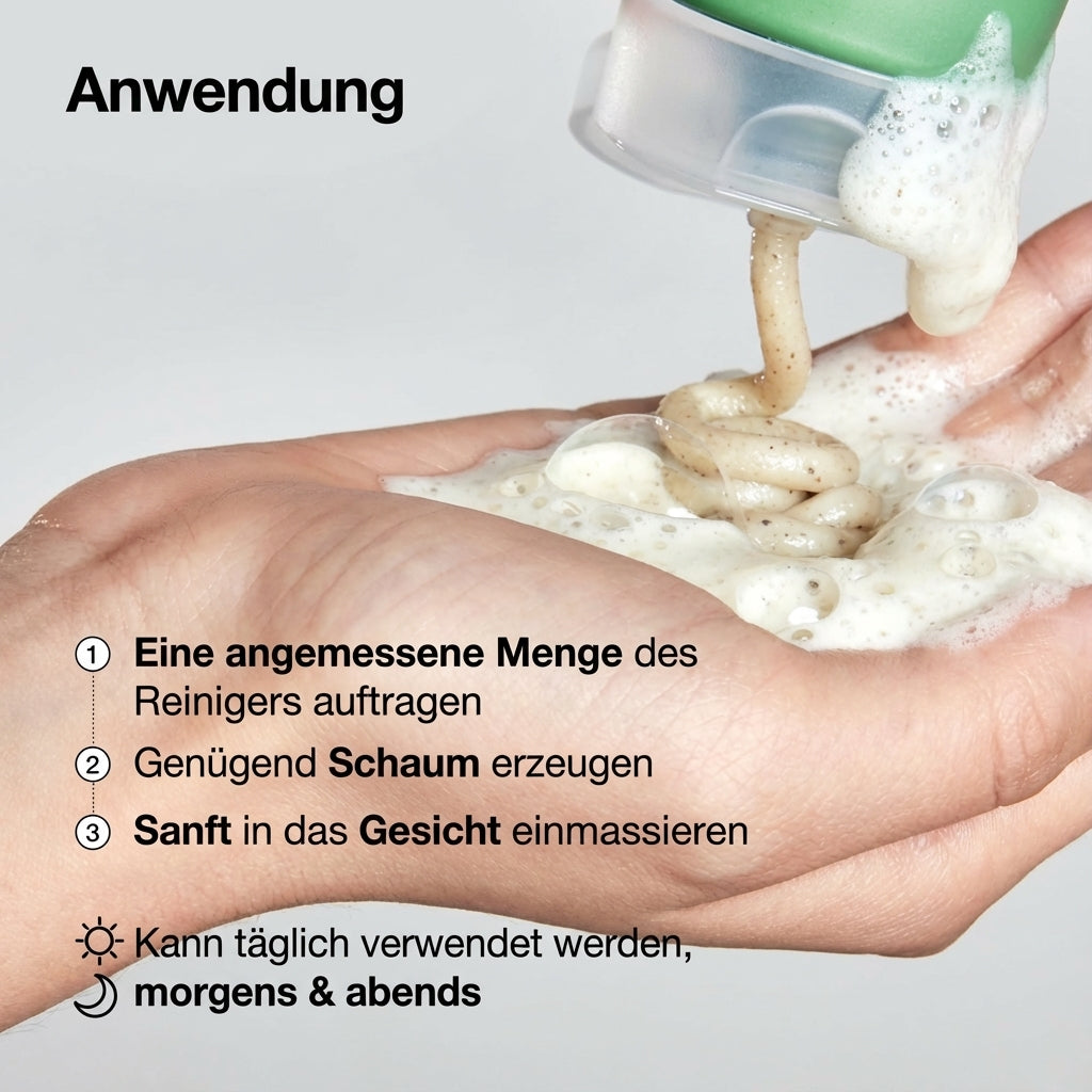 Eine kleine Menge mit Wasser aufschäumen und 20–30 Sekunden ins feuchte Gesicht einmassieren. Gründlich abspülen. Danach wie gewohnt pflegen.