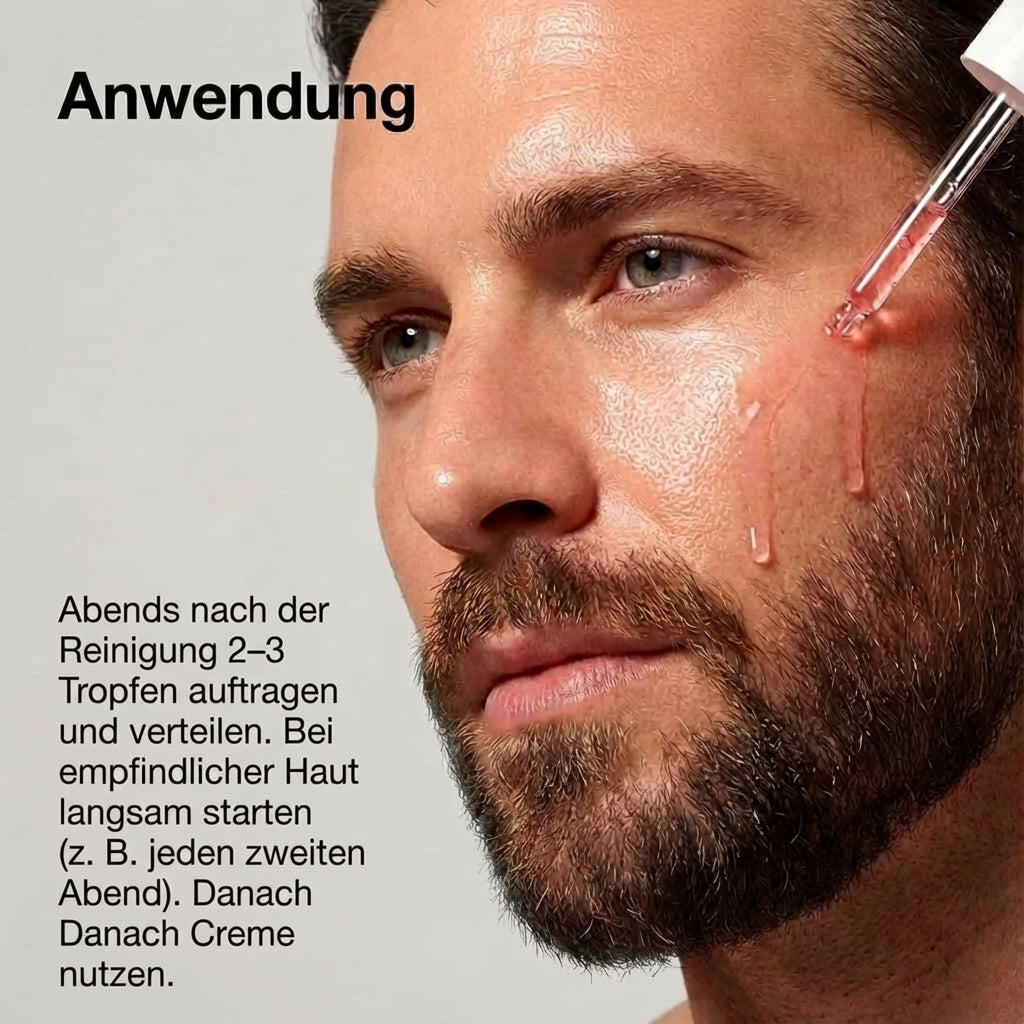 Abends nach der Reinigung 2–3 Tropfen auftragen und verteilen. Bei empfindlicher Haut langsam starten (z. B. jeden zweiten Abend). Danach Creme nutzen.
